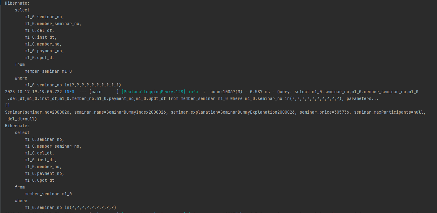 batchSize가 작동하는것처럼 보이지만, 결국에는 각 세미나의 입장에서 보면 모든 member_seminar를 다시 호출하고있습니다. 우리가 원하는것처럼 Seminar_no를 가지고서 한번에 member_no를 다 불러들여서 JPA N+1 문제를 해결할 수 없었습니다.