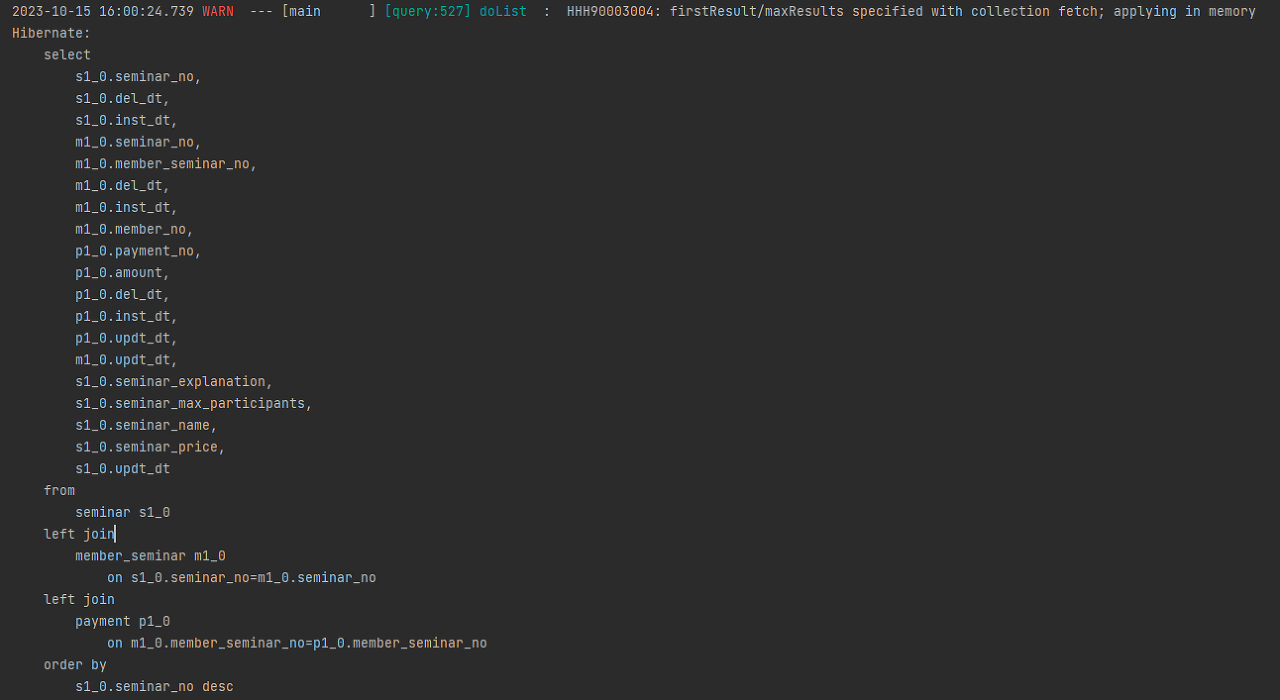 아래부터는 특정 Seminar를 Pagination하는 방식과 Member_Seminar 입장에서 페이징하는 방식을 담아보았습니다.