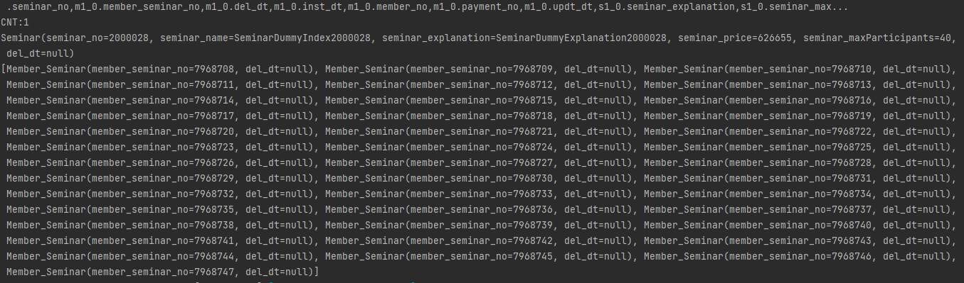 @Transactional //Proxy 유지 @DisplayName("test getListForMember_SeminarAndPayment") @Test public void testgetListSeminarWithFetchJoin() throws InterruptedException { Long member_no = 1L; Long seminar_no = 2000028L; int pageNo = 0; int pageSize = 10; List<Seminar> seminar = seminarQuerydslRepository.getListSeminarWithFetchJoin(pageNo, pageSize); System.out.println("CNT:"+seminar.size()); for(int i=0;i<seminar.size();i++){ System.out.println("---------------------------------------"); System.out.println("Seminar:"+seminar.get(i).toString()); for(int j=0;j<seminar.get(i).getMember_seminar_list().size();j++){ System.out.println(seminar.get(i).getMember_seminar_list().get(j).toString()); System.out.println(seminar.get(i).getMember_seminar_list().get(j).getPayment().toString()); } } }